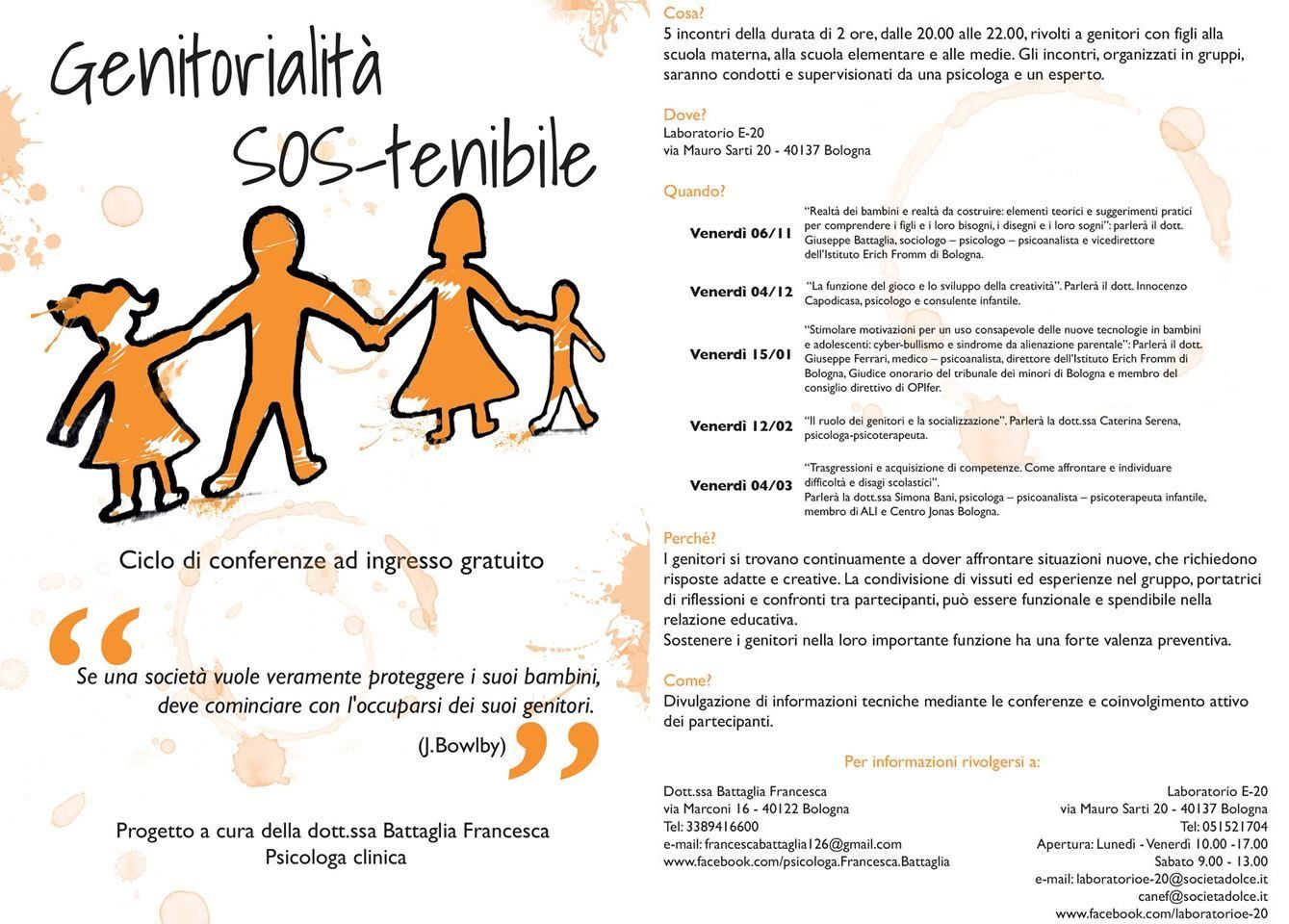 Ho collaborato con un centro di clinica dell’infanzia, mia grande passione, e ho fatto un ciclo di incontri per genitori: due edizioni di GENITORIALITÀ SOS-tenibile in collaborazione con il Laboratorio E-20, in vai Mauro Sarti 20.